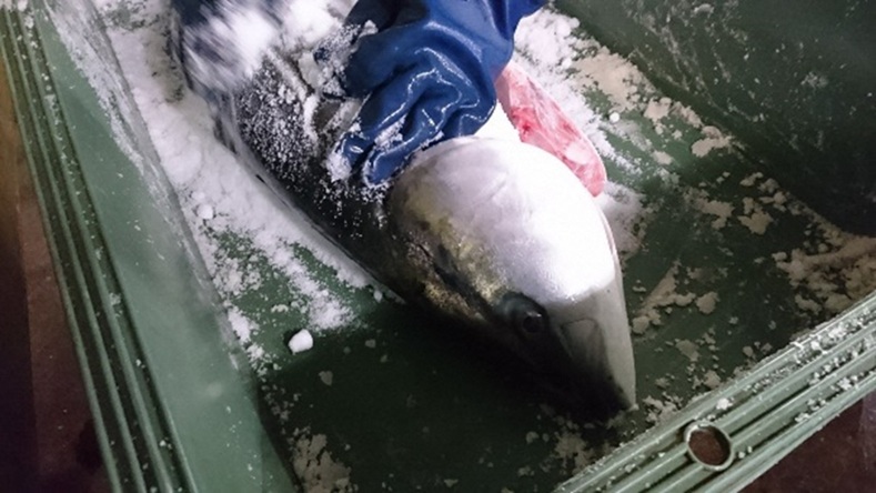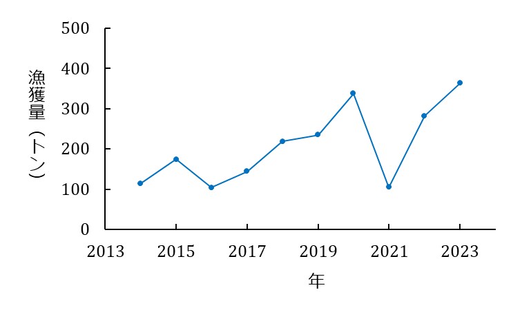 ブリは、富山県沿岸では主に11~1月に定置網漁によって漁獲される。近年(2014~2023年)の富山県におけるブリの漁獲量は104~363トンの範囲にあり、平均約218トンである(図1)。これらを原料とする塩ぶりの生産量は年間10トン程度であると推定される。近年、大型(製品重量7kg以上)の塩ぶりよりも、小型(製品重量3~5kg程度)の塩ぶりの消費が増加している。