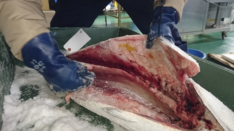 従来は、セミドレス(エラと内臓を除去したもの)であったが、近年は、切り身とする場合がほとんどである(写真6)。