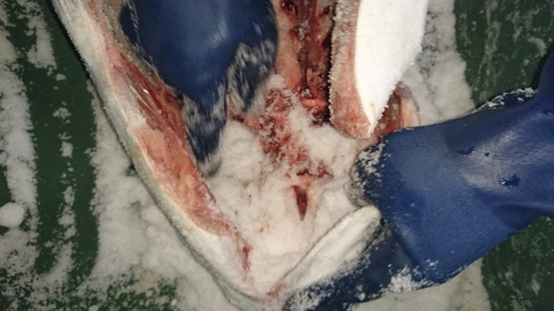 - 塩漬け 振り塩漬けの場合は原料魚と同量の食塩で内部および外側によくすり込む(写真1~4)。さらに、同量の食塩を振りかけ、2日ほど漬け込む。