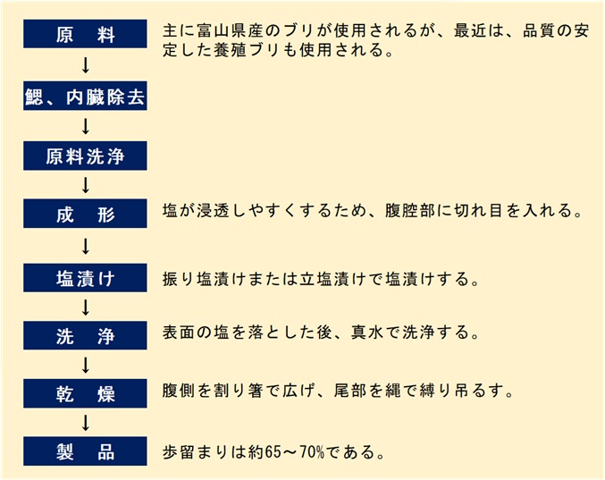 近年の大量、高速輸送システムと鮮度保持技術の発達により、ブリは生鮮品として全国各地に送られ、刺身や焼き魚として賞味されるようになり、この塩ブリは今では生産量はごくわずかであるが、江戸時代から続く伝統食品として受け継がれている。